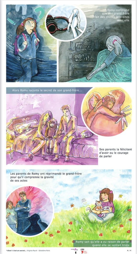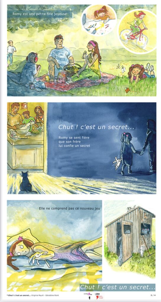 Livre de sensibilisation pour les enfants, illustré par Géraldine Point, mis en audio, en Braille, en Langue des Signes avec sous-titres et audiodescription, en FALC ( Facile A Lire et à Comprendre)les pictogrammes, tableau de communication et Exposition interactive avec les illustrations. Le premier livre de prévention sur les violences sexuelles et sur l’inceste avec tous les outils pour les enfants en situation de handicap notamment. (Productrice de l’audio sensibilisation).