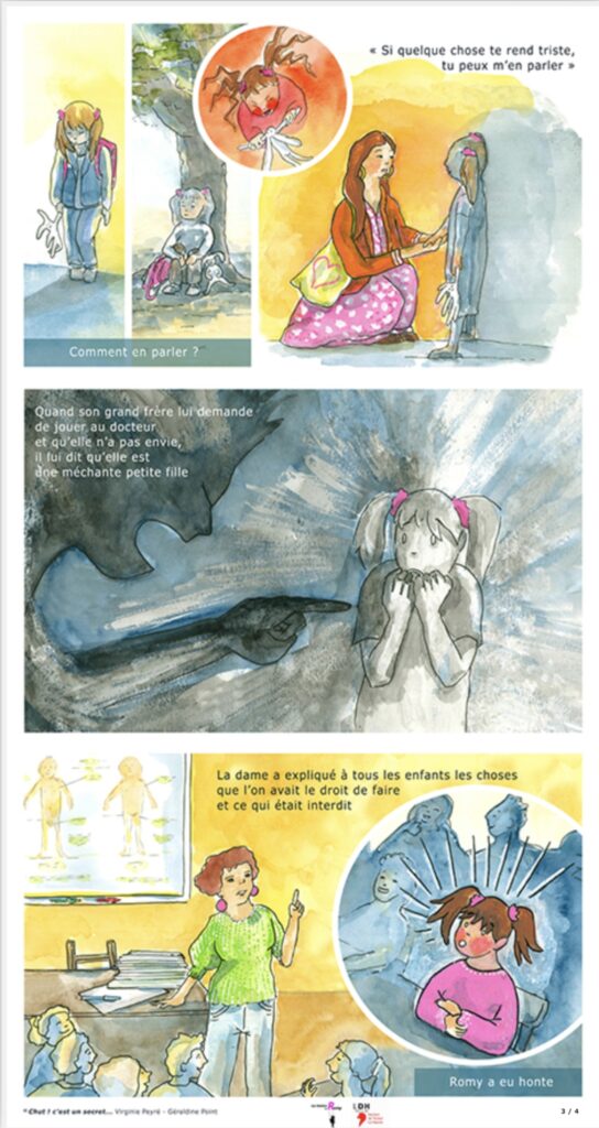 Notre sensibilisation est développée pour activer différents stimuli: visuels et auditifs afin que l’enfant identifie sa souffrance sans culpabilité et ni honte, dans la sécurité de pouvoir parler à quelqu’un de confiance.