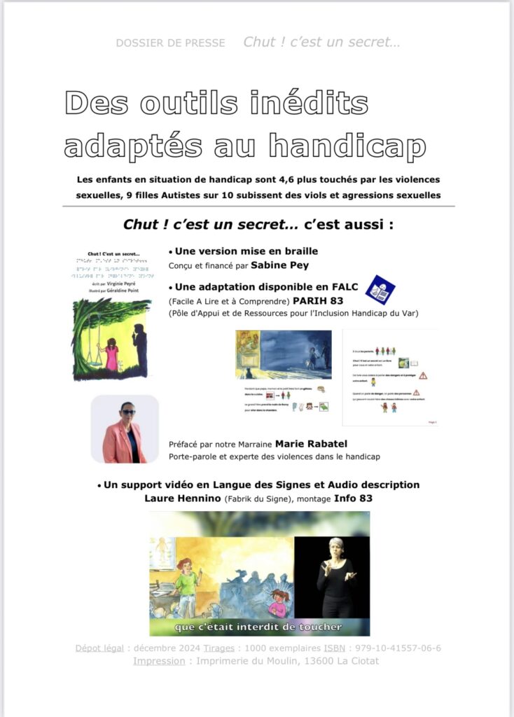LE PREMIER LIVRE DE SENSIBILISATION SUR LES VIOLENCES SEXUELLES ET SUR L’INCESTE DECLINE EN PLUSIEURS OUTILS POUR LE HANDICAP: ILLUSTRATIONS/ AUDIO/ BRAILLE/ LANGUE DES SIGNES FRANCAISE/ VIDEO SOUS-TITREE/ AUDIO DESCRIPTION/ QR CODES AUDIO CHANSON/ FALC/ TABLE DE COMMUNICATION/ EXPOSITION INTERACTIVE AUDIO.