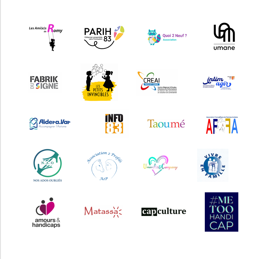La sensibilisation pour les enfants en situation de handicap ainsi que l’accompagnement sur les suivis thérapeutiques et judiciaires sont en collaboration avec nos nombreux partenaires comme Intimagir Paca, le Creai Paca Corse, les Poupées Matassa, des éducatrices spécialisées dans l’Autisme ainsi que la porte-parole française sur les violences dans le Handicap : Marie Rabatel.